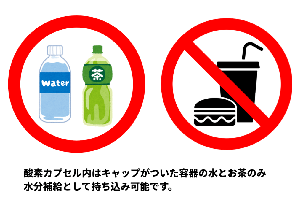 エアコンが近いのと、乾燥を感じる方もいらっしゃるので、水とお茶(糖分など入っていないもの)でしたら倒れても溢れない容器でしたら持ち込み可となっています。