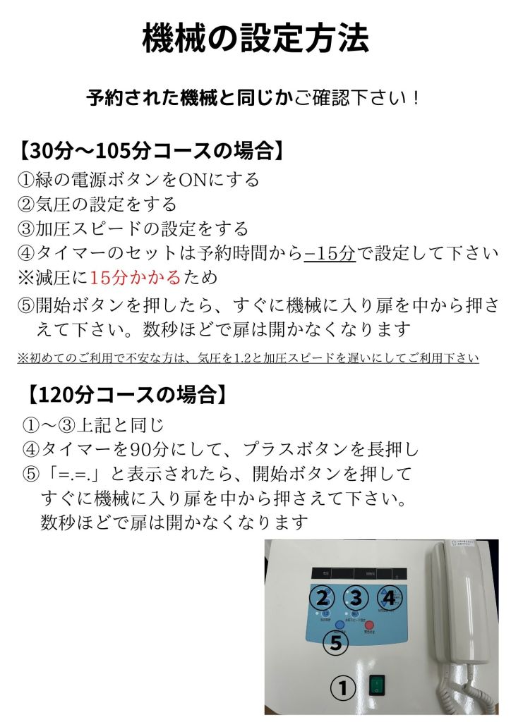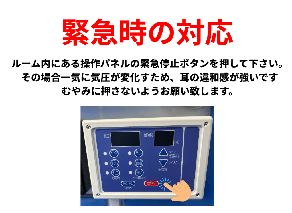 途中具合が悪くなった場合など、緊急の場合は緊急停止ボタンで5分ほどで除圧をすることが可能です。