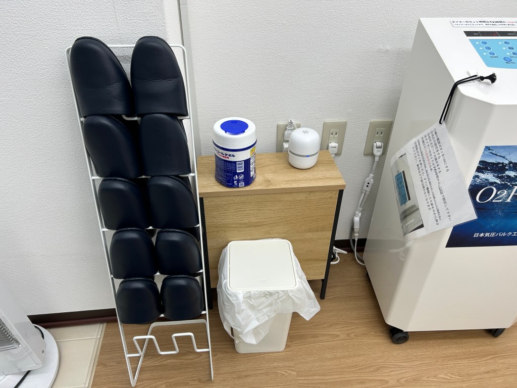 終了後は部屋の左側の小さな台に除菌シートをご用意しておりますので、そちらで酸素ボックス内、使用した備品を拭いてご退室下さい。